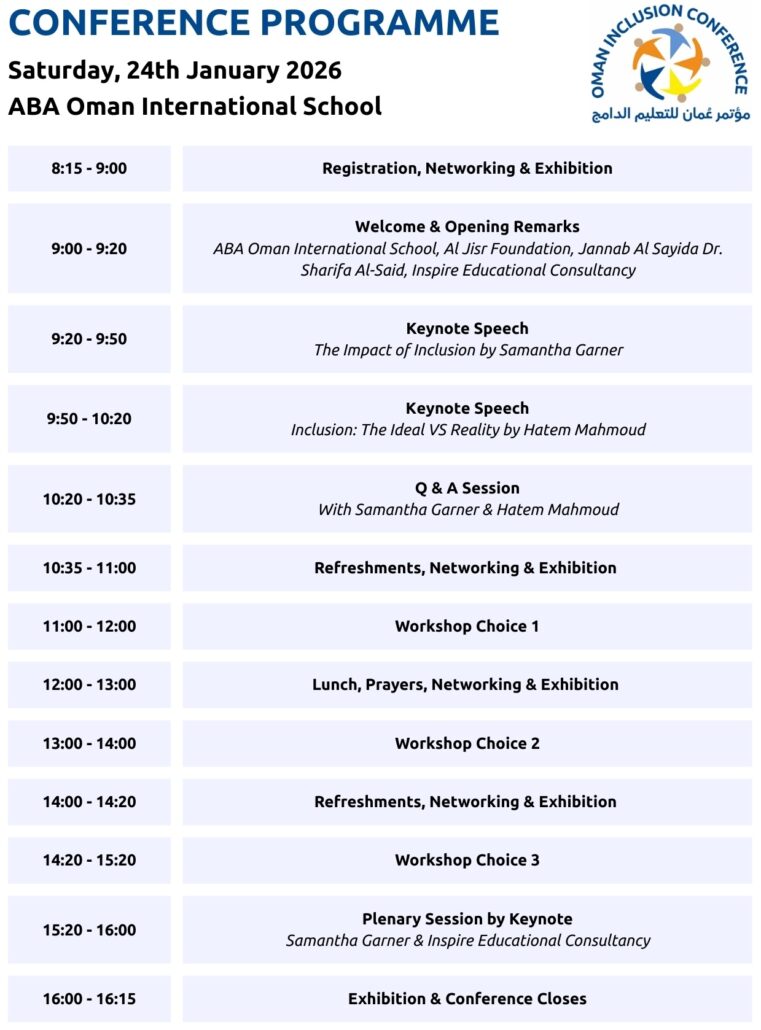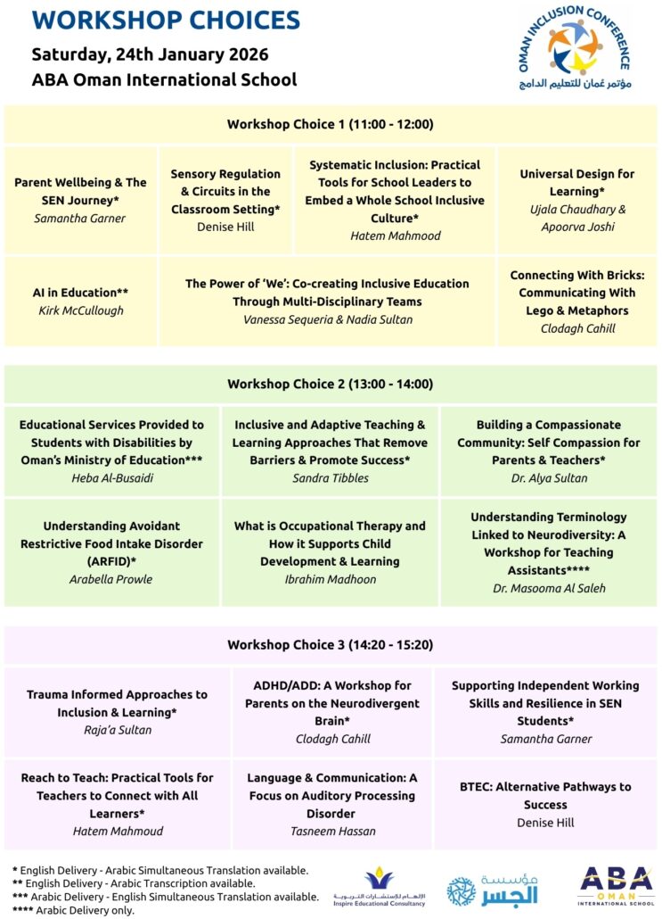 Building on the success of the inaugural event, the second conference will be graciously hosted by ABA Oman International School on Saturday January 24th 2026, and whose support underscores a shared dedication to fostering inclusive educational communities. The Oman Inclusion Conference 2026 will continue to strive to cultivate strong networks of collaboration and community, provide attendees with actionable strategies, professional development, and meaningful opportunities to network and exchange knowledge. Having heard previous participant feedback, this second event will seek to provide tracks of workshops for attendees to select from. And, as before, provide simultaneous translation throughout the sessions in the interest of accessibility for both English and Arabic speakers.